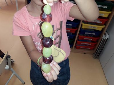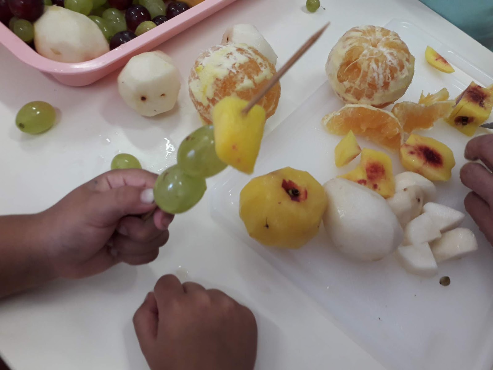 Ao colocar a fruta nos paus de espetadas, algumas crianças construíram padrões e partilharam com os colegas.