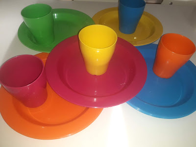 A pensar no ambiente e no excesso de plástico nas nossas vidas, nosso mundo: pratos e copos coloridos...