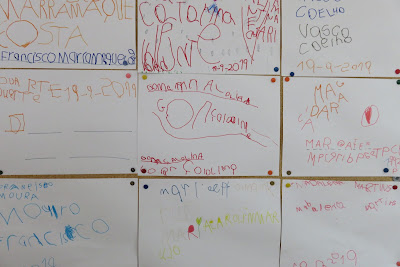As fotos possíveis de publicar revelam um pouco das vivências das crianças na Sala C durante esta semana primeira semana: atividades escolhidas pelas crianças, colocar os nomes nos mapas porque a organização é muito importante, merenda da manhã, pão com centeio à sexta-feira, momentos de meditação, " Parar, Respirar, Acalmar...articulando leituras na biblioteca, recorte e colagens, conversas a pares, construções, descobertas nas áreas das ciências e matemática, escrita do nome próprio e apelido, as letras maiúsculas e minúsculas (algumas crianças até disseram que eu estava a escrever mal o nome delas, porque estavam em letras minúsculas, temos de reservar um momento do trabalho curricular comparticipado para falar em coletivo sobre esta questão)...